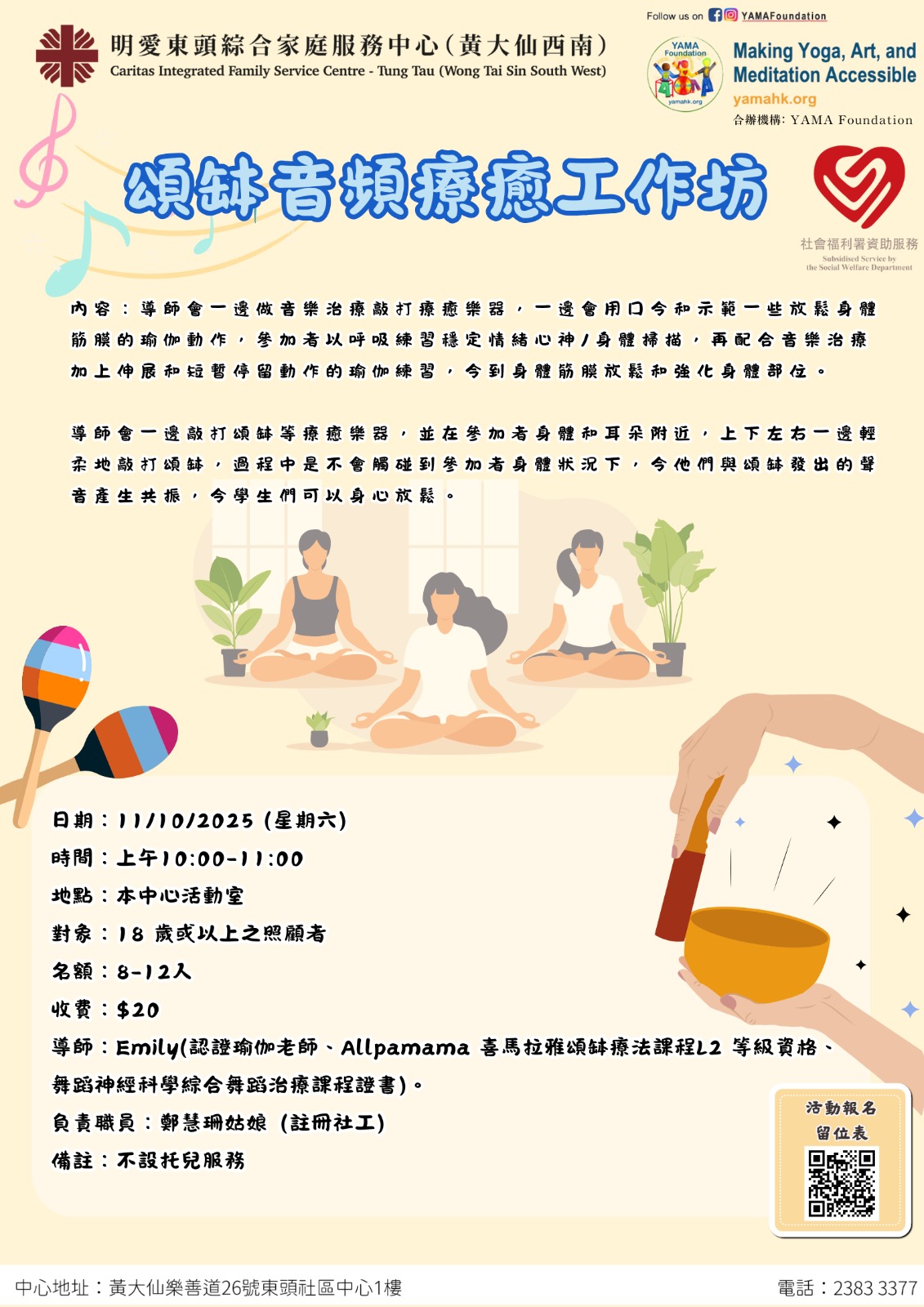 導師:Emily(認證瑜伽老師、Allpamama 喜馬拉雅頌缽療法課程L2 等級資格、舞蹈神經科學綜合舞蹈治療課程證書)。